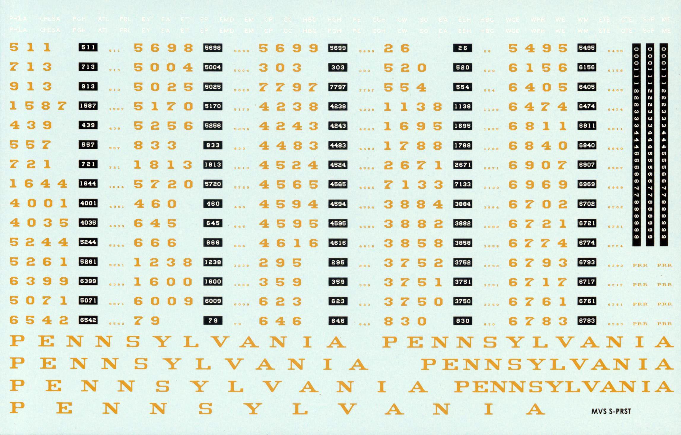 There are 75 canned ready to use numbers with corresponding headlight and back of cab decals. Each number was chosen after days of research reviewing Pennsy photo collections and books. If you have the Edson roster you will see that almost all were running rather late in steam, and had a connection with the PRSL and/or the Philadelphia area. There are some hopeful PRR steam class numbers on the sheet, you never know what can happen in S scale! And lastly the color has been PRR guru approved.